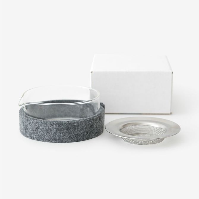 温かいお茶をたのしむためのフェルトスリーブです。様々なシーンに合わせやすいグレーカラーの展開。やわらかなフェルトが優しくグラス急須を包みます。