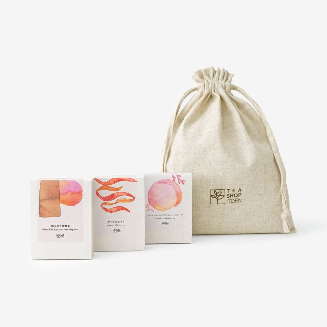 オリジナルラッピング巾着に包まれたおすすめのフルーツティー3種セット。ギフトにおすすめです。
