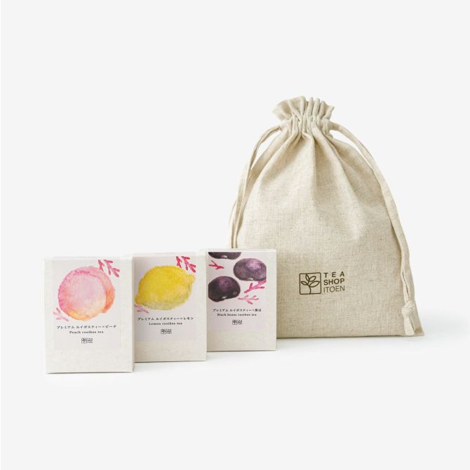 オリジナルラッピング巾着に包まれたルイボスティー3種セット。ギフトにおすすめです。