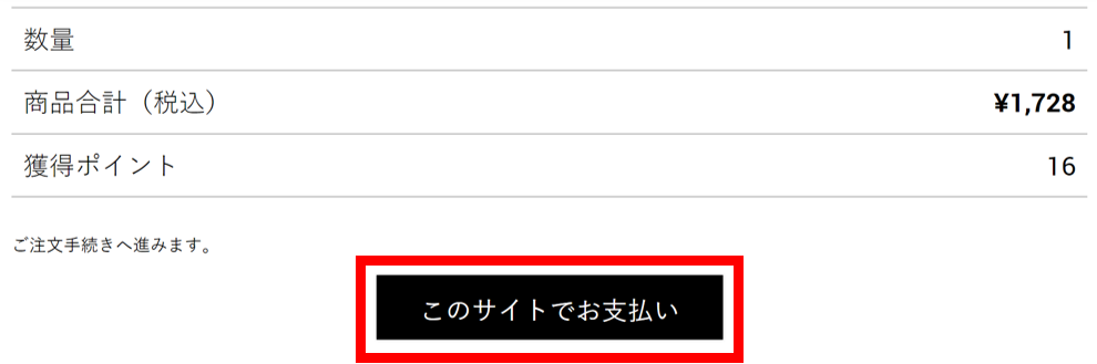 購入したい商品をカートに追加して、カートページの「このサイトでお支払い」を押します。